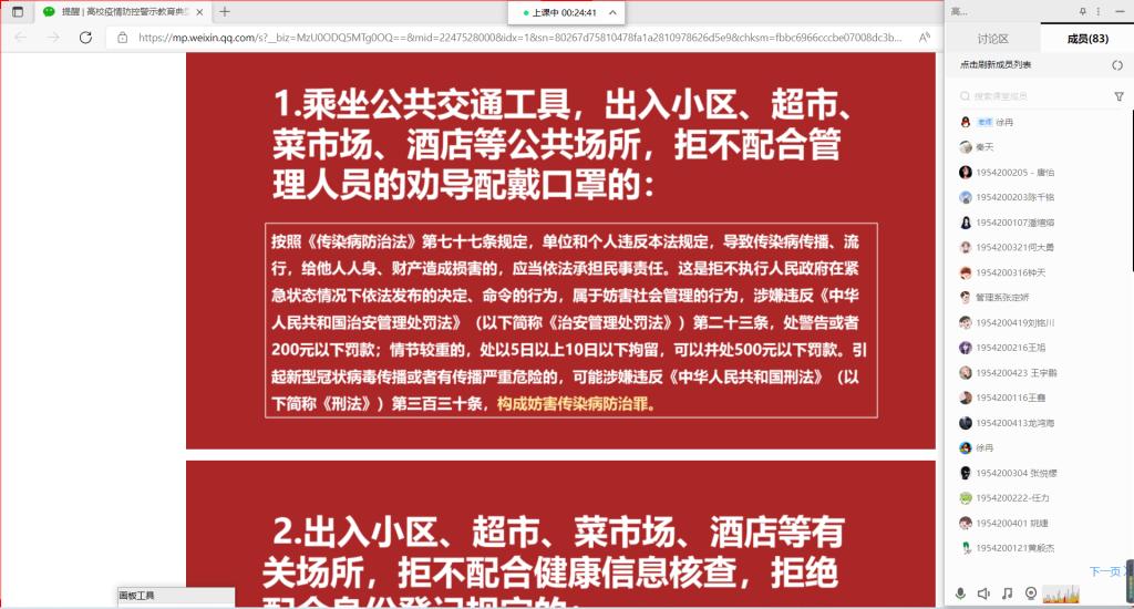 为贯彻落实学校关于疫情防控工作的最新精神和要求,进一步严明纪律,强化警示教育,4月5-4月10日,商学院各年级于线上以主题团课、主题班会、大点名等多种形式组织开展《高校疫情防控典型案例》警示主题教育。会议由各年级辅导员主持会议,全体学生参加。