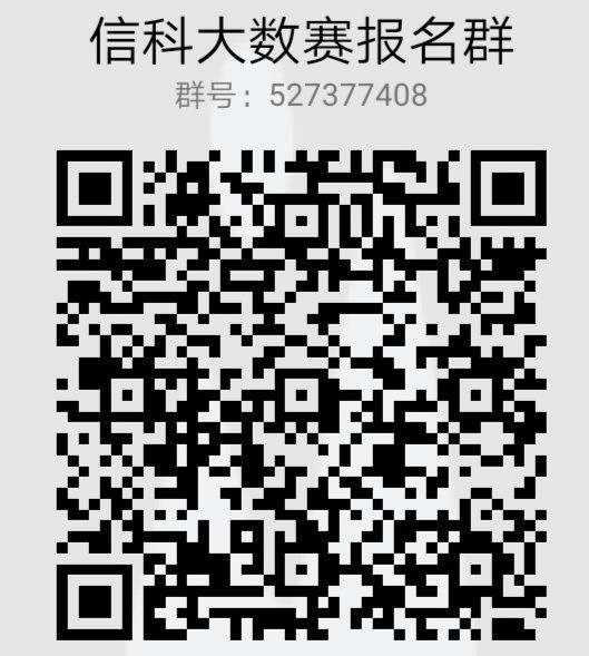 4.报名要求:各参赛院校于2023年9月25日前统一报名(不接受学生个人报名),报名表见附件;学生报名需扫码加入“信科大数赛报名群”,在群内联系报名负责人曹站坤同学完成报名,截止时间为9月21日晚22:00,群号527377408,群二维码如下:
