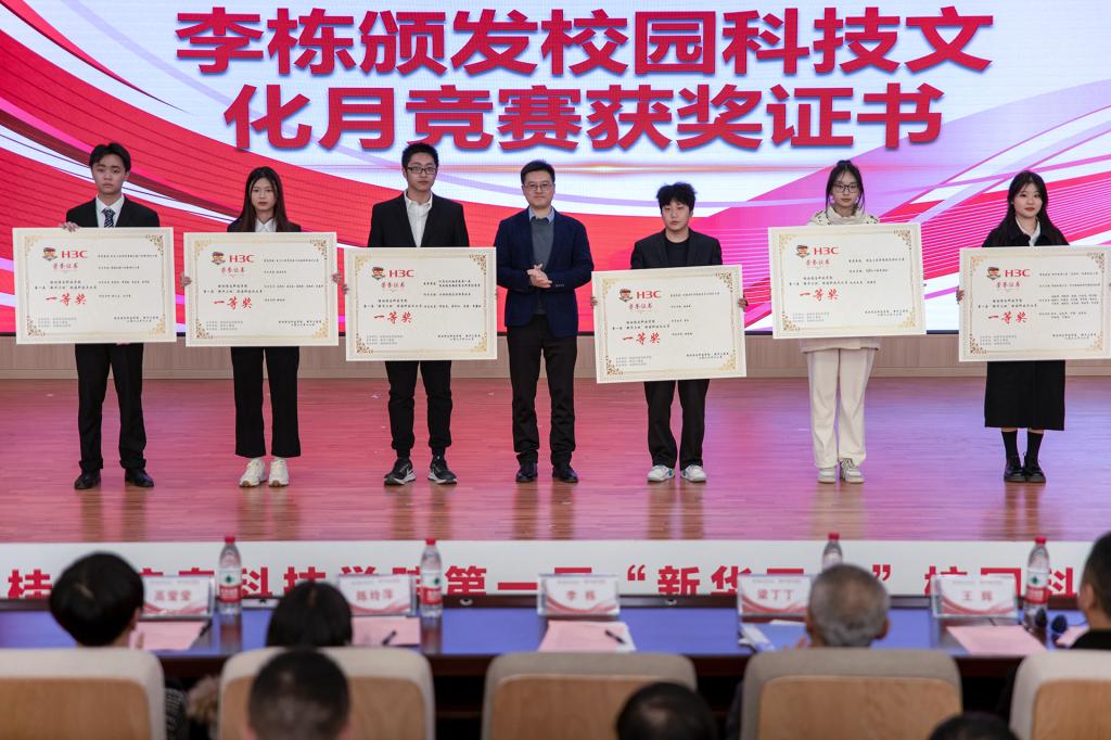 新华三集团广西代表处副总经理李栋为本届科技文化月获奖学生代表颁发荣誉证书
