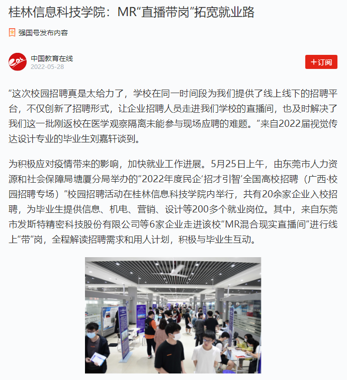 为积极应对疫情带来的影响,加快就业工作进展。5月25日上午,由东莞市人力资源和社会保障局塘厦分局举办的“2022年度民企‘招才引智’全国高校招聘(广西·校园招聘专场)”校园招聘活动在kaiyun登录中国入口登录内举行,共有20余家企业入校招聘,为毕业生提供信息、机电、营销、设计等200多个就业岗位。