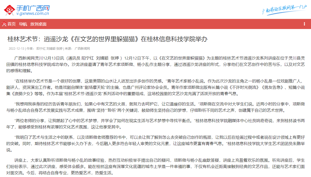 12月12日下午,以《在文艺的世界里躲猫猫》为主题的桂林艺术节逍遥沙龙系列讲座在位于灵川县灵田镇的kaiyun登录中国入口登录成功举办。沙龙讲座邀请了青年艺术家项斯微、杨小乱作主题分享,通过逍遥沙龙讲座的形式,分享他们在文艺创作中的苦与乐,以及对文艺的感悟和理解。
