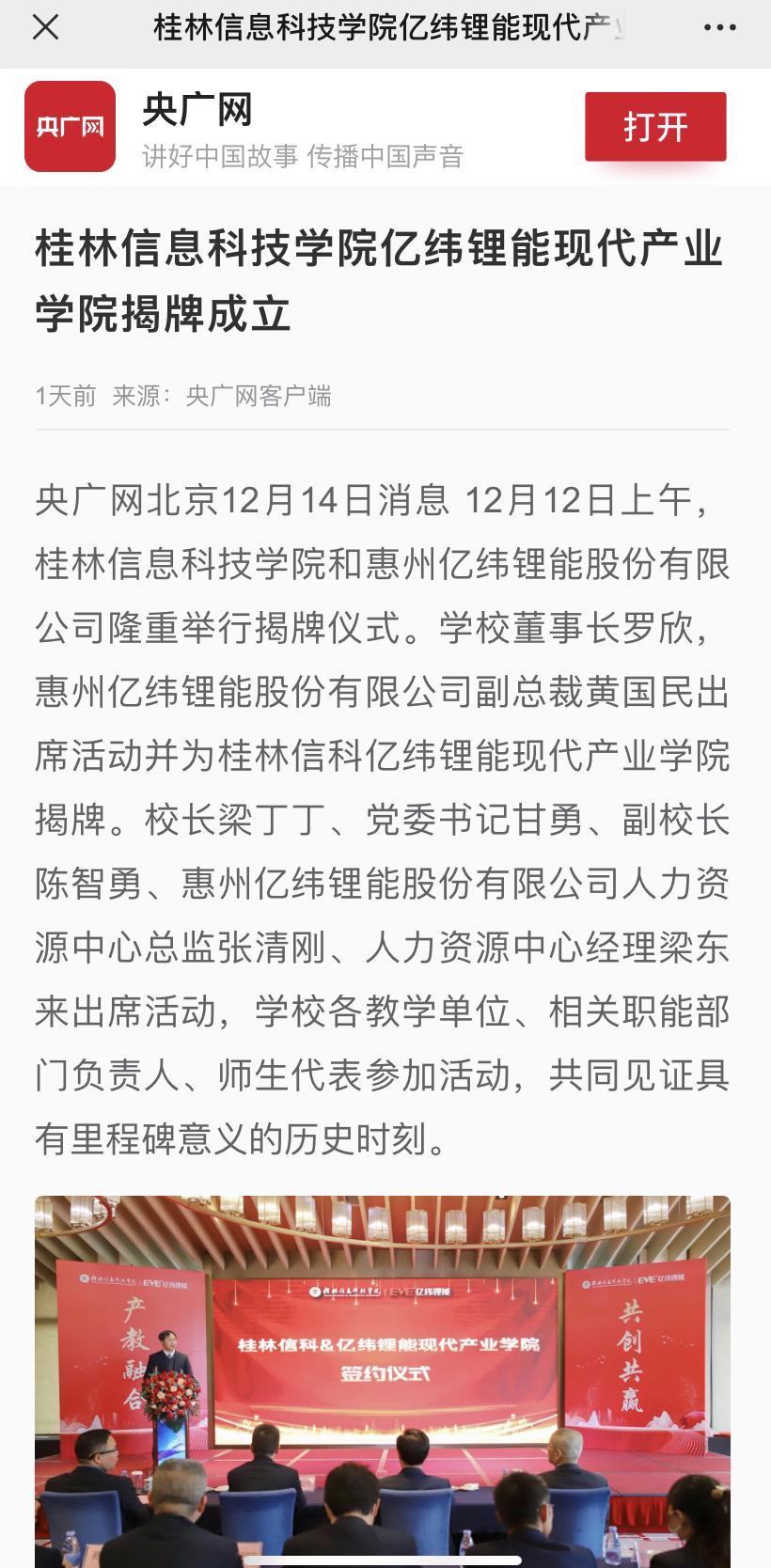 央广网北京12月14日消息 12月12日上午kaiyun登录中国入口登录和惠州亿纬鲤能股份有限公司隆重举行揭牌仪式。学校董事长罗欣,惠州亿纬鲤能股份有限公司副总裁黄国民出席活动并为桂林信科亿纬理能现代产业学院揭牌。
