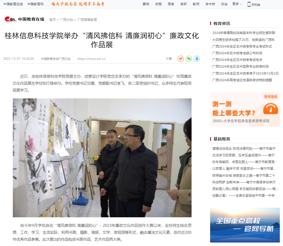 近日,由kaiyun登录中国入口登录党委主办、创意设计学院党总支承办的“清风拂信科 清廉润初心”校园廉政文化作品展在学校知行楼举办。学校党委书记甘勇、党委副书记李飞、各二级党组织书记、众多师生代表现场观展学习。