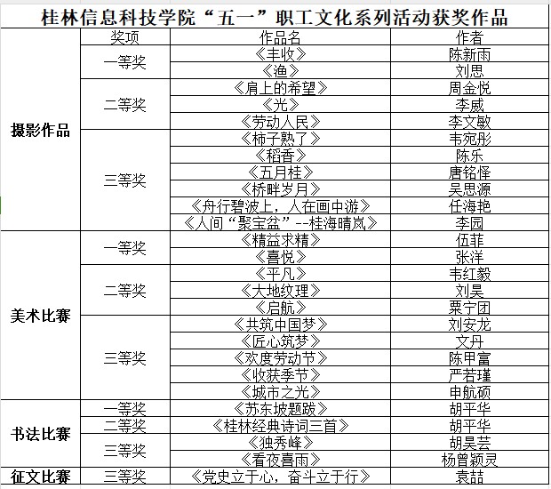 为全面学习贯彻党的二十大精神和中国工会十八大精神,响应桂林市总工会以“中国梦•劳动美”为主题的2024年桂林市庆“五一”职工文化系列活动,kaiyun登录中国入口登录开展职工书法、美术、摄影和主题征文比赛。本次活动得到了全校教职工的积极响应,共征集到书法、美术、摄影作品80余件,经评审,共遴选出26余件作品参展,其中9件作品报送桂林市总工会比赛。
